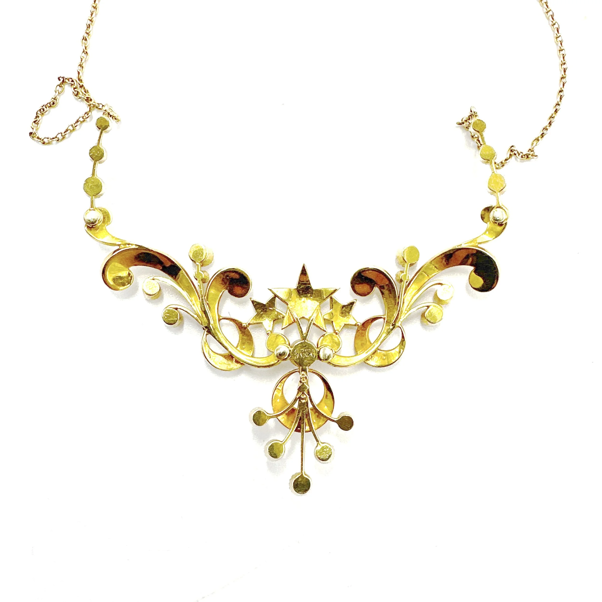 A stunning antique Edwardian 15K yellow gold necklace featuring intricate craftsmanship and elegant pearls.