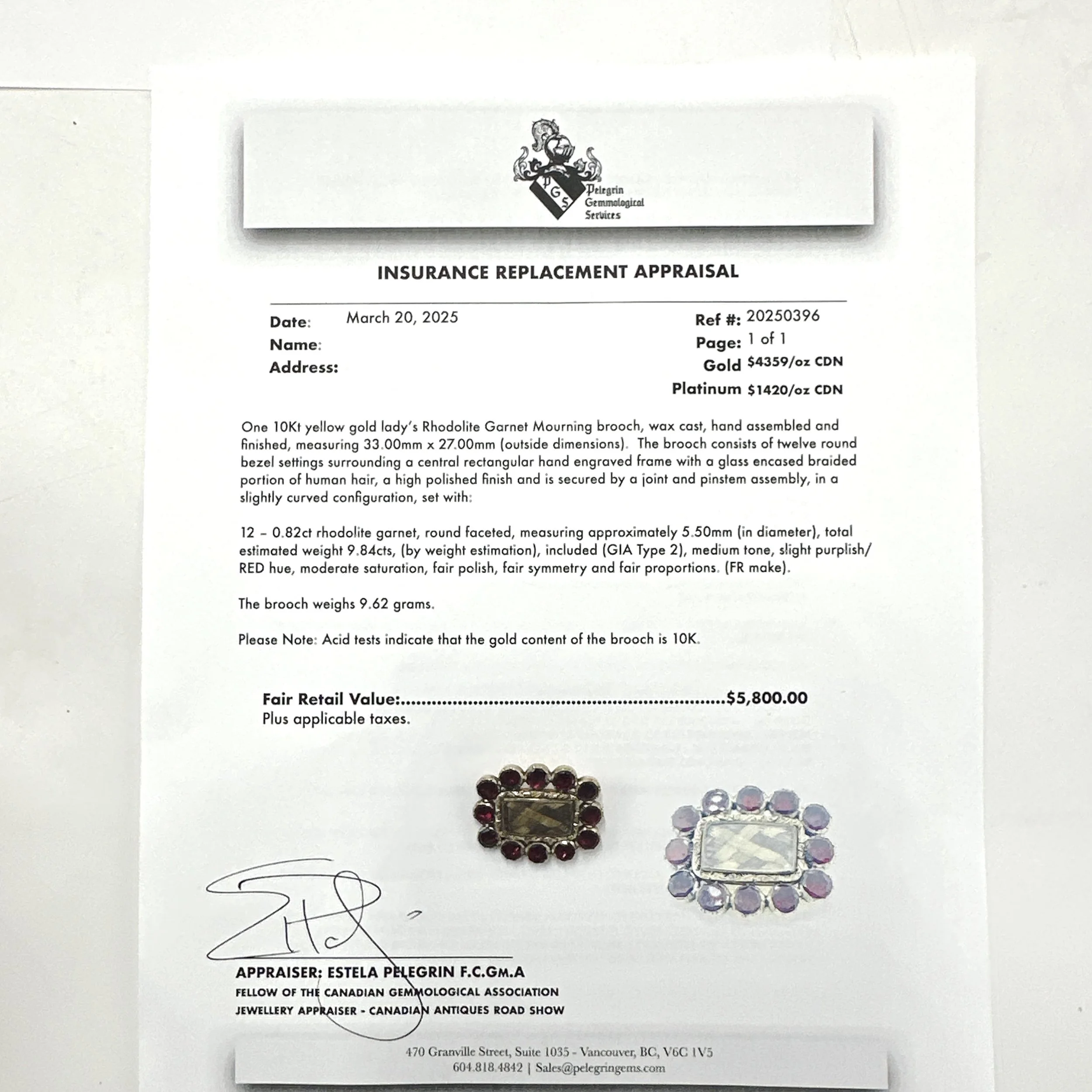 This intricately made mourning brooch is crafted in 10K yellow gold using a wax cast, hand-assembled and hand-finished technique. The piece measures approximately 33.00 mm by 27.00 mm and features twelve round bezel-set rhodolite garnets (0.82 ct each), arranged around a central rectangular frame. The frame is hand engraved and contains a glass-enclosed braided portion of human hair—typical of 19th-century mourning jewelry traditions.