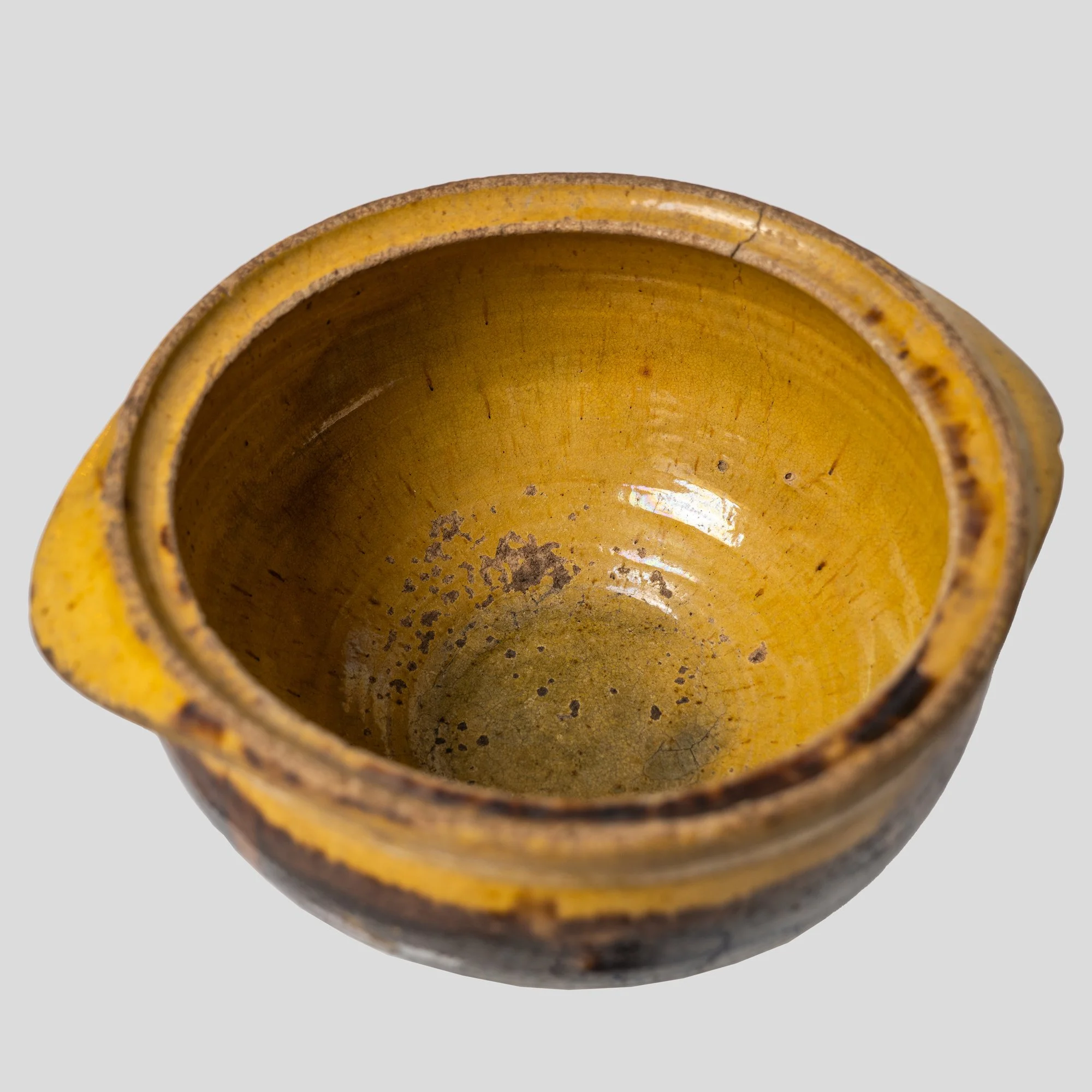 The terrine is glazed brown and yellow, with molded detailing on the lid. Item originates from Languedoc, circa early 18th century